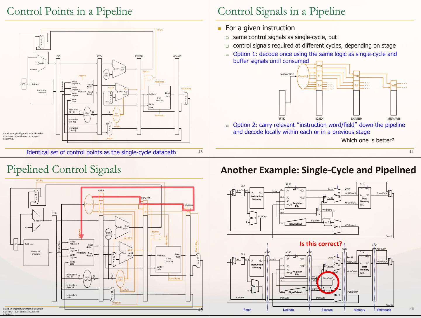 Similarly, the control signals needed for an instruction are generated (typically in the ID stage, like in our multi-cycle FSM control) and passed down the pipeline registers along with the instruction’s data. Each stage uses the control signals relevant to that stage from the pipeline register arriving at its input.