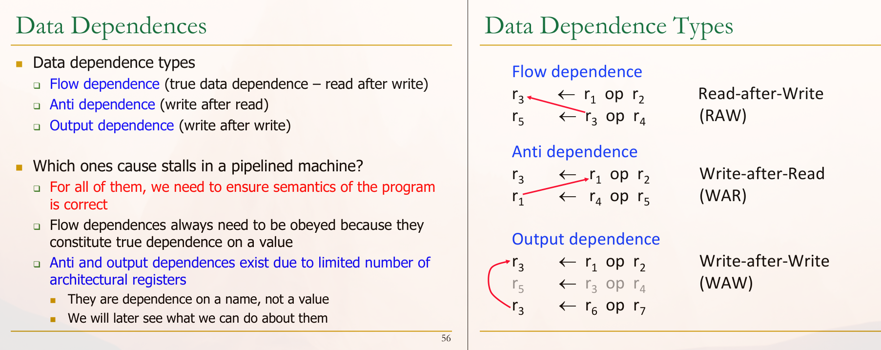 - Flow Dependence (RAW - Read After Write): A later instruction reads a register that a prior instruction writes.