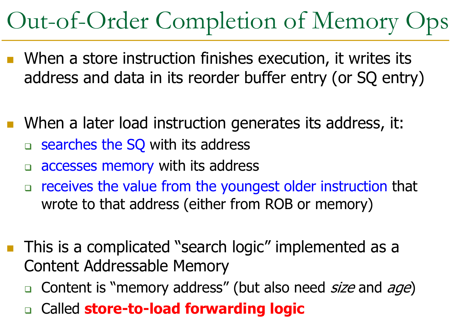 - Renaming memory addresses, unlike registers, is difficult because addresses are dynamic properties, not static identifiers known at decode.