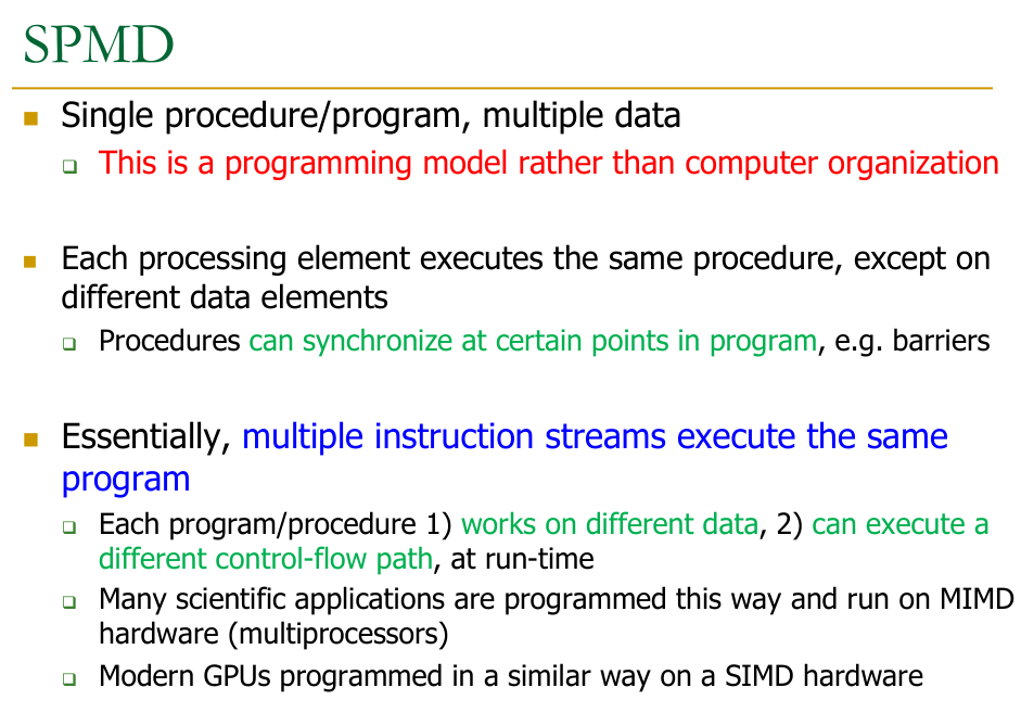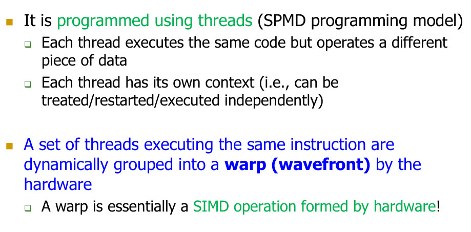 GPUs employ a programming model called SPMD (Single Program, Multiple Data), where multiple threads run the same program code but operate on different data. This model is well-suited for data-parallel workloads where the same computation is applied to many data elements. The GPU hardware then takes this SPMD code and executes it efficiently on its underlying SIMD/SIMT architecture.