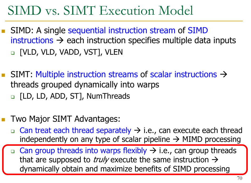 This lecture highlighted GPUs as sophisticated SIMD processors that exploit data parallelism through warp-based execution. The SIMT programming model allows developers to write code using threads while the hardware dynamically groups them into warps for SIMD execution on specialized functional units. This approach, combined with warp-level fine-grained multithreading, effectively hides latency and leverages available parallelism, particularly for data-parallel workloads common in graphics and machine learning. While branch divergence remains a challenge, techniques like dynamic warp merging help mitigate its impact on SIMD utilization. The evolution of GPUs demonstrates a continuous increase in parallelism and the addition of specialized units like Tensor Cores to meet the demands of emerging applications.