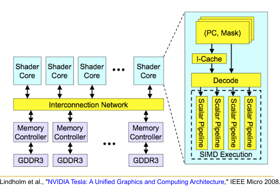 A GPU core typically contains a SIMD pipeline, often referred to as a Streaming Processor (SP) in NVIDIA terminology. Many such SPs are grouped together into a Streaming Multiprocessor (SM).