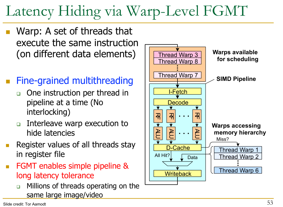 GPUs leverage warp-level fine-grained multithreading to hide latency. An SM can interleave the execution of multiple warps on its simple, in-order scalar pipelines. If a warp stalls (e.g., waiting for data from memory), the SM can quickly switch to another ready warp, keeping the functional units busy and hiding the latency. This requires storing the context (PC, registers) for many warps.