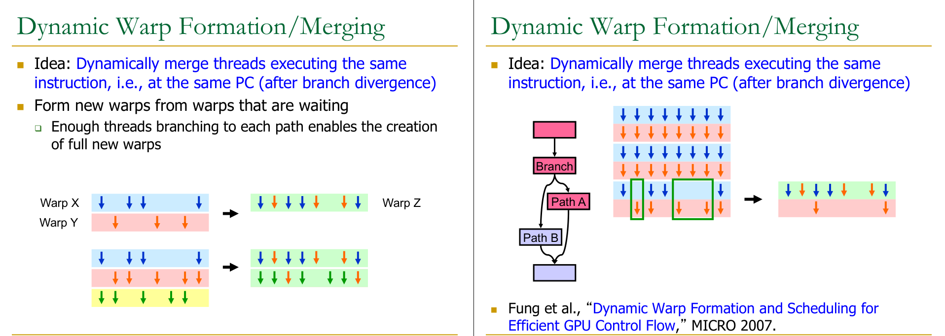 GPUs employ techniques like Dynamic Warp Formation/Merging to mitigate the performance loss from divergence. After a divergent branch, threads are potentially re-grouped based on their actual execution path to form new warps with higher SIMD utilization (fewer masked-out threads).