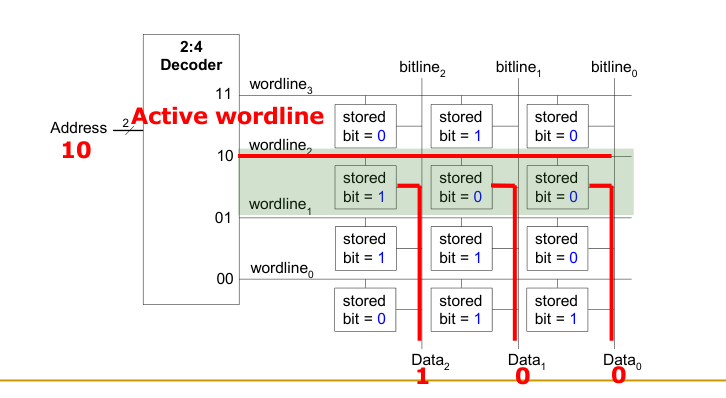 - DRAM (Dynamic Random Access Memory): Slower, uses one transistor and one capacitor per bit. Stores data as charge level. Cheaper, higher density. Requires periodic refresh due to capacitor leakage (reading and restoring charge). Read is destructive (discharges bitline), requiring the activated row’s data to be written back to the array after sensing. Used for main memory (larger capacity).