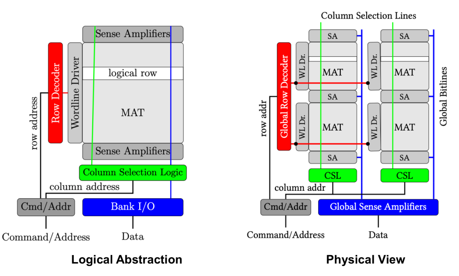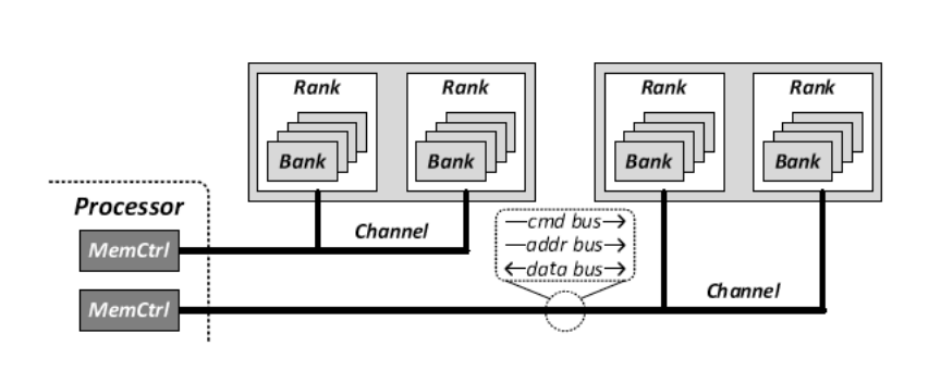 - Chips: A DRAM chip contains multiple banks (typically 8 or 16). Banks within a chip share external pins for command, address, and data buses to reduce chip cost and pin count.
