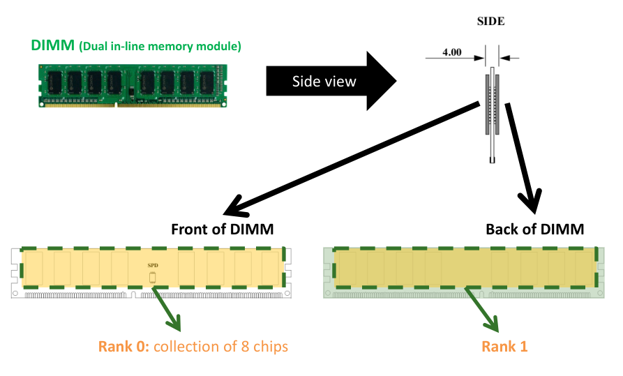 - DIMMs (Modules): A physical board containing one or more ranks (e.g., chips on front and back).