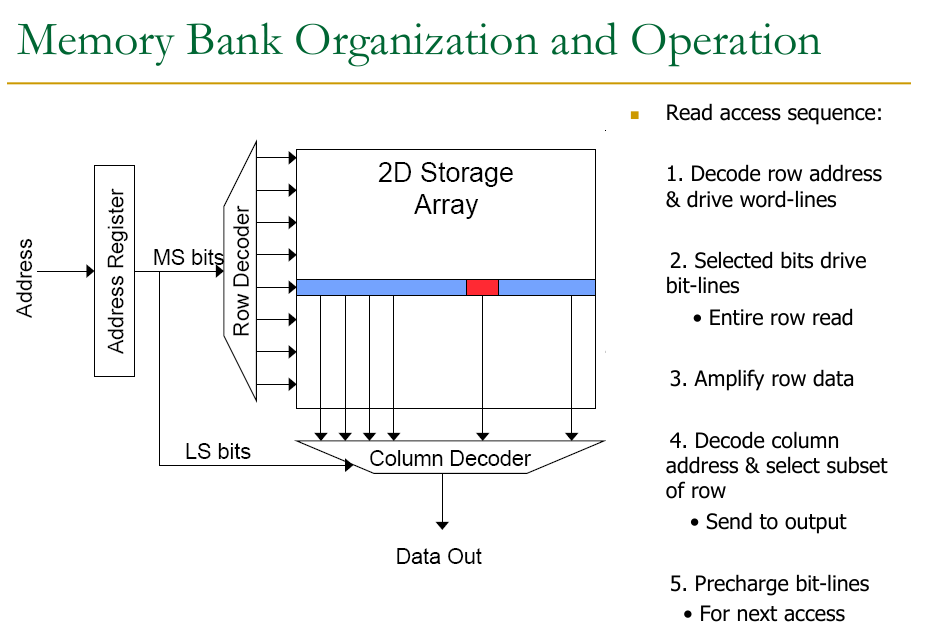 - ACTIVATE (Row Access): The row address (RAS - Row Address Strobe) is sent, decoded by the row decoder, asserting a wordline. This connects the cells in that row to the sense amplifiers (row buffer). The sense amplifiers sense the small charge perturbation on the bitlines, amplify the data, and latch the entire row into the row buffer. This takes significant time due to the physics of sensing small charges over long bitlines.