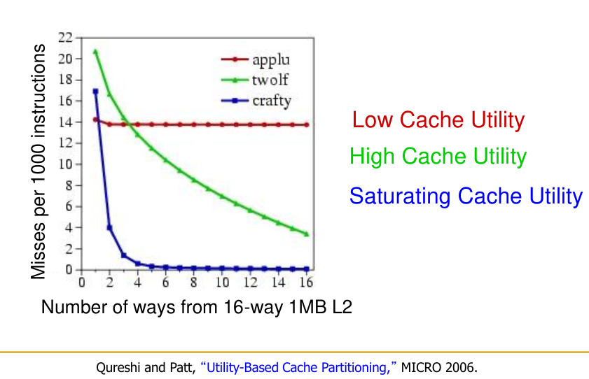 Larger caches can hold more of an application’s working set (actively used data), improving temporal locality and hit rates. However, very large caches are slower and costlier. The benefit of increasing cache size varies greatly among applications, with some showing low utility, some high utility, and others saturating once their working set fits.