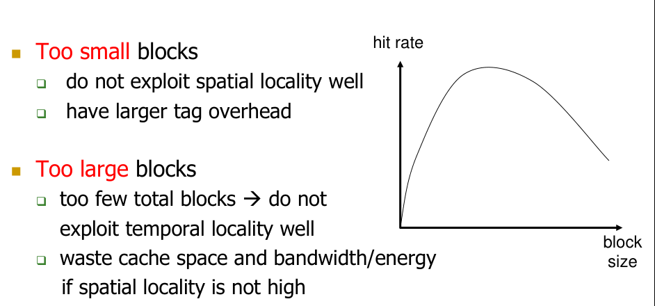 - Large blocks: Good for spatial locality but can reduce the number of distinct blocks in a fixed-size cache (hurting temporal locality) and increase miss penalty. Wasted bandwidth if only a small part of the large block is used.