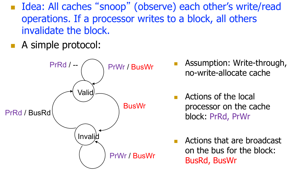 Snoopy (Broadcast-Based) Coherence: Caches monitor (snoop) a shared bus for memory operations. When a write to a shared block occurs, other caches holding that block either invalidate or update their copies.
