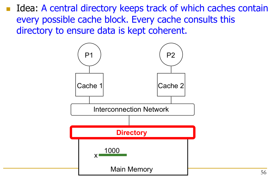 Directory-Based Coherence: A central (logically) directory keeps track of which caches have copies of which blocks. Processors consult the directory for permission to read/write. The directory orchestrates invalidations/updates.