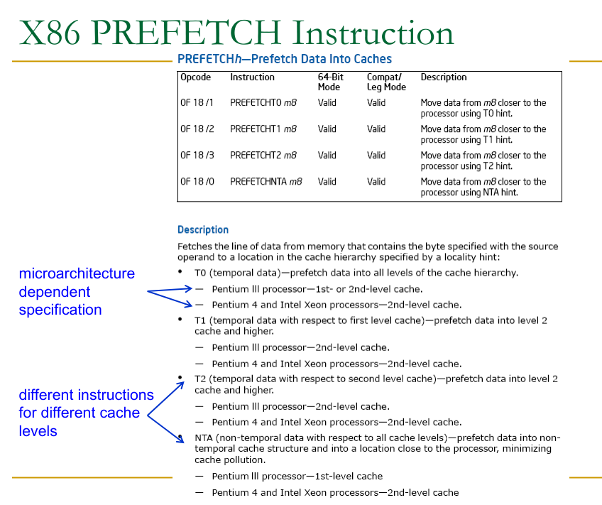 - Prefetching into L2 or L3 is more common for hardware prefetchers; these levels are larger and act as a buffer.