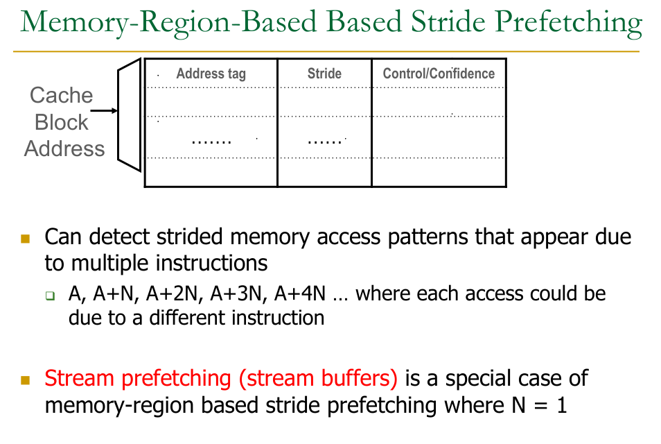 - Idea: Record the stride between consecutive memory accesses. If the stride is stable (repeats consistently), use it to predict and prefetch the next M memory accesses (A+3N, A+4N, …, A+(2+M)N).