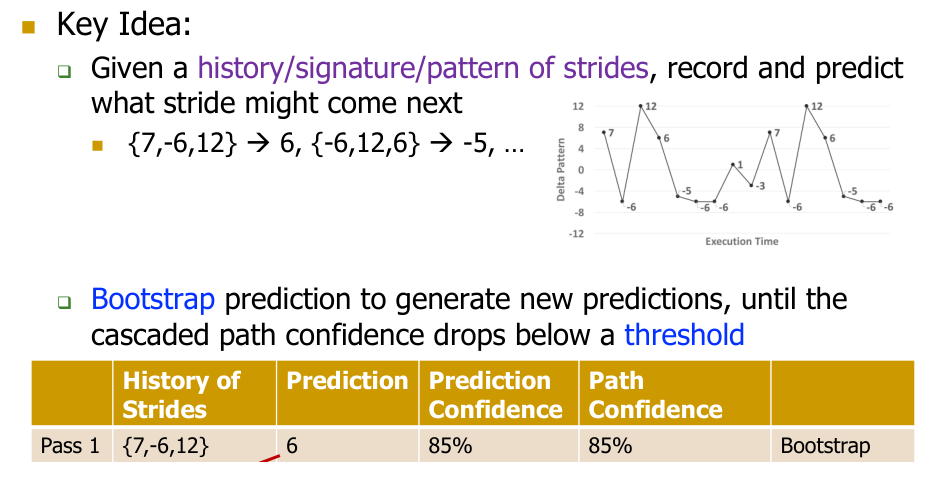 - Can use bootstrap prediction: the predicted next stride is used to extend the history, allowing further predictions until a confidence threshold is met. This allows prefetching far ahead.
