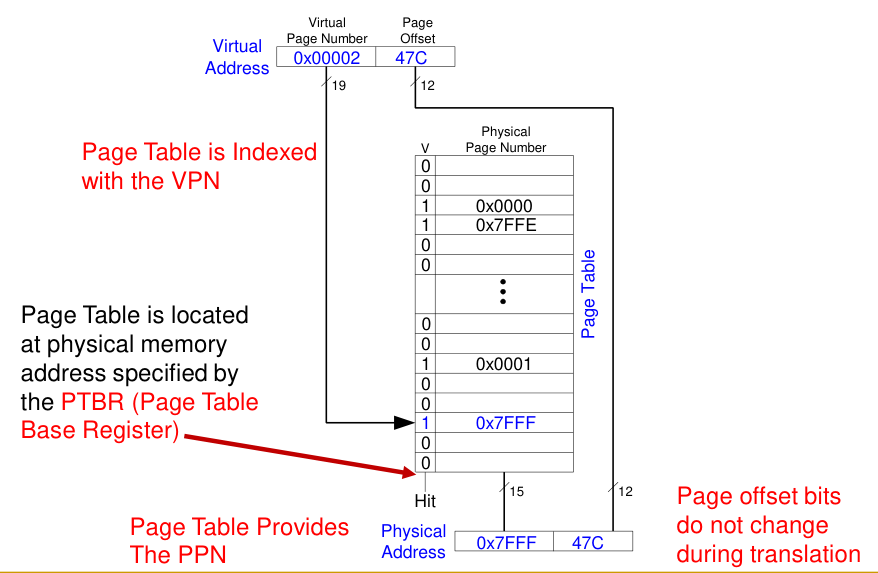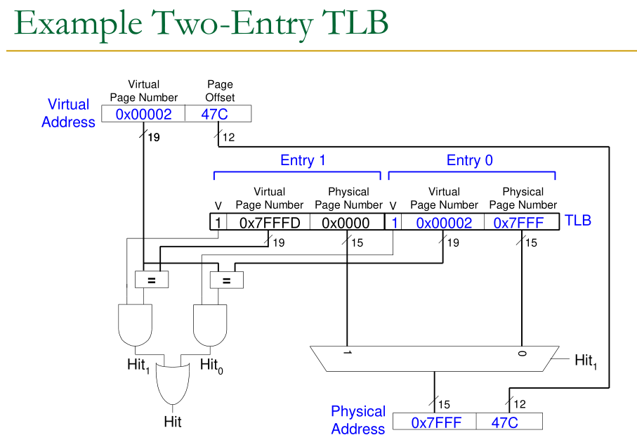 - TLB Hit: If the VPN is found in the TLB (a TLB hit), the corresponding PPN is retrieved directly from the TLB. Address translation is fast (e.g., 1 cycle), and no page table walk (memory accesses) is needed.