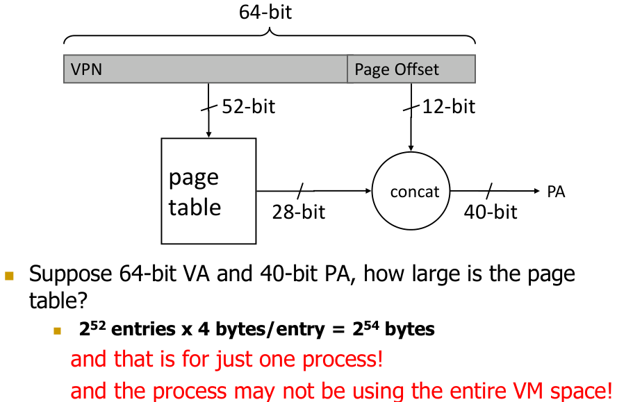 As discussed, a single-level page table for a large virtual address space (e.g., 64-bit) would be impractically enormous (e.g., 16 Petabytes).