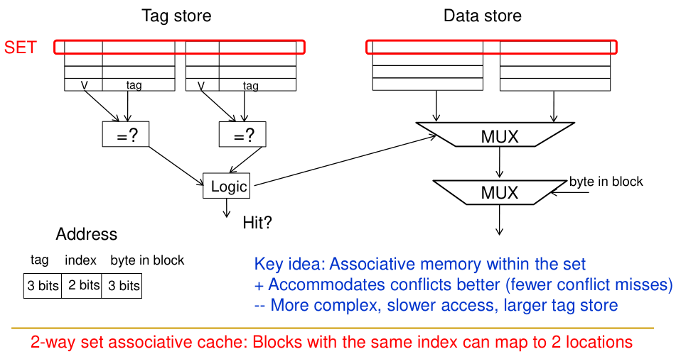 Cons: More complex than direct-mapped, requiring N tag comparators and a MUX to select the data from the correct way on a hit. Access time and power may increase with associativity.