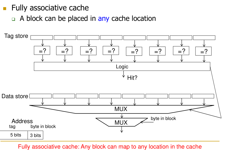 Cons: Requires comparing the incoming address tag with the tag of every line in the cache simultaneously, making it complex, slow for large sizes, and power-hungry. Used for small structures like TLBs.