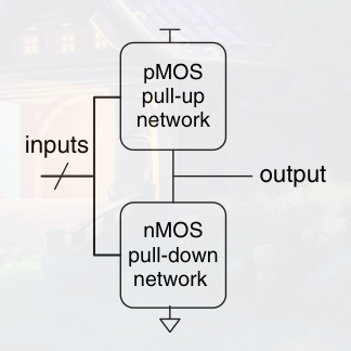 Recall that pMOS transistors are strong ‘1’ passers (excellent at connecting to Vdd) but weak ‘0’ passers. Conversely, nMOS transistors are strong ‘0’ passers (excellent at connecting to GND) but weak ‘1’ passers.