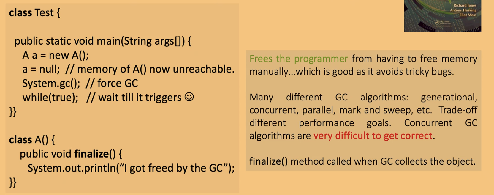 Different GC algorithms (generational, concurrent, parallel, mark-and-sweep, etc.) offer trade-offs in terms of performance characteristics. Concurrent GC algorithms are notoriously difficult to implement correctly. The finalize() method in Java is called (if defined) when the garbage collector reclaims an object, though its use is generally discouraged in modern Java.