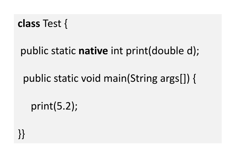 The JVM needs to handle the parameter passing and type conversions to ensure correct interaction with the native code on the specific platform. While not a large module, the native interface can be tricky to implement correctly, especially regarding type safety. java.lang.Object contains many native methods (e.g., for starting a thread), for which the JVM provides an internal implementation.