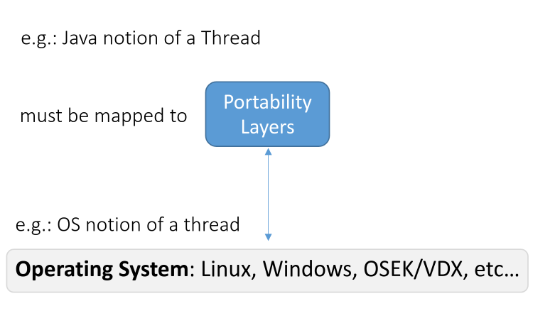 For example, Java has its own notion of a thread. The portability layer maps this Java thread concept to the specific thread implementation of the underlying operating system, ensuring consistent behavior across different platforms. If you want to port the JVM to a new operating system, you primarily need to implement the portability layer.