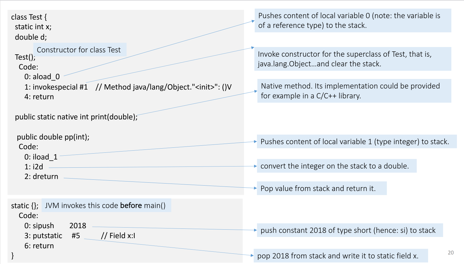 This slide shows the bytecode for the class constructor, the pp method, and the static initializer. We can see instructions like aload_0 (push the ‘this’ reference onto the stack), invokespecial (call a special method, in this case, the superclass constructor), iload_1 (push a local integer variable onto the stack), i2d (convert an integer to a double), sipush (push a short integer constant onto the stack), and putstatic (store a value in a static field).