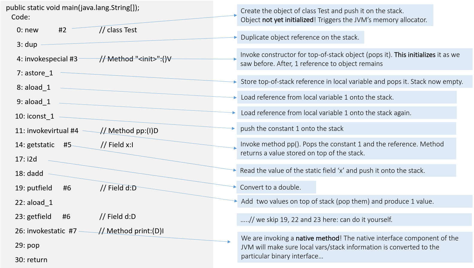 This slide shows the bytecode for the main method. It demonstrates object creation (new), method invocation (invokevirtual, invokestatic), field access (getstatic, putfield), and stack manipulation (dup, dadd, pop). It also shows the invocation of a native method (invokestatic #7).