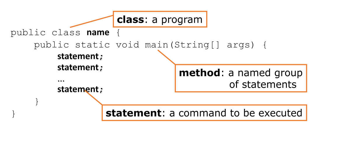 A Java program consists of classes. An executable Java program must have a main method, which contains the statements (commands) to be executed. Methods are named groups of statements.