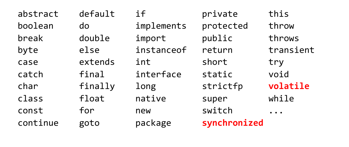 Keywords are reserved identifiers with predefined meanings in Java (e.g., class, public, static, void, int, if, else, for, while, synchronized, volatile).
