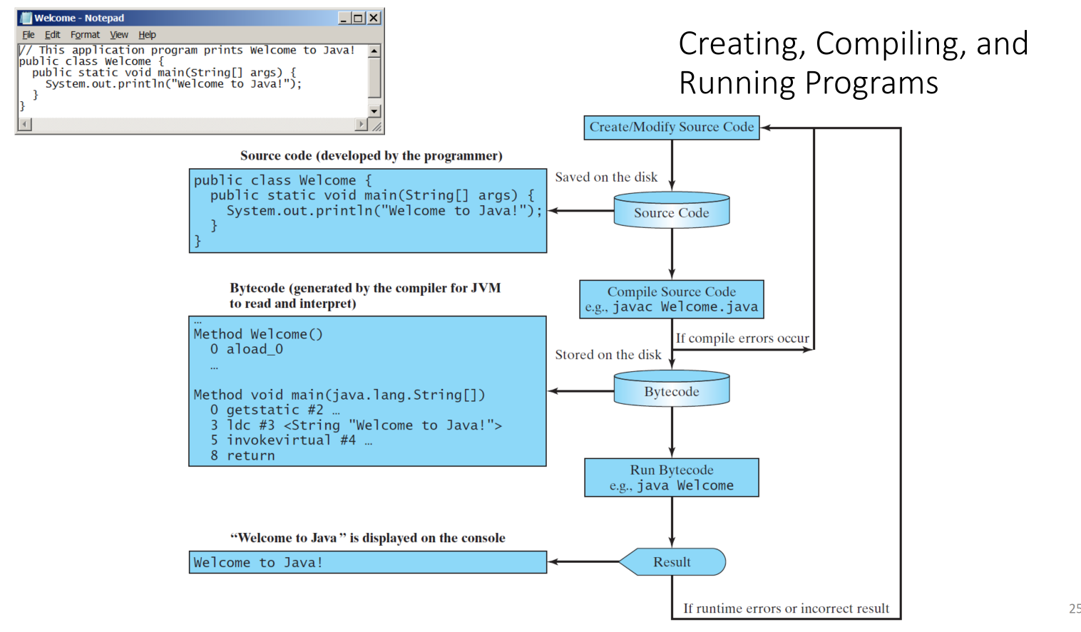 This slide illustrates the process: source code is written, compiled into bytecode using javac, and then executed by the JVM using java.