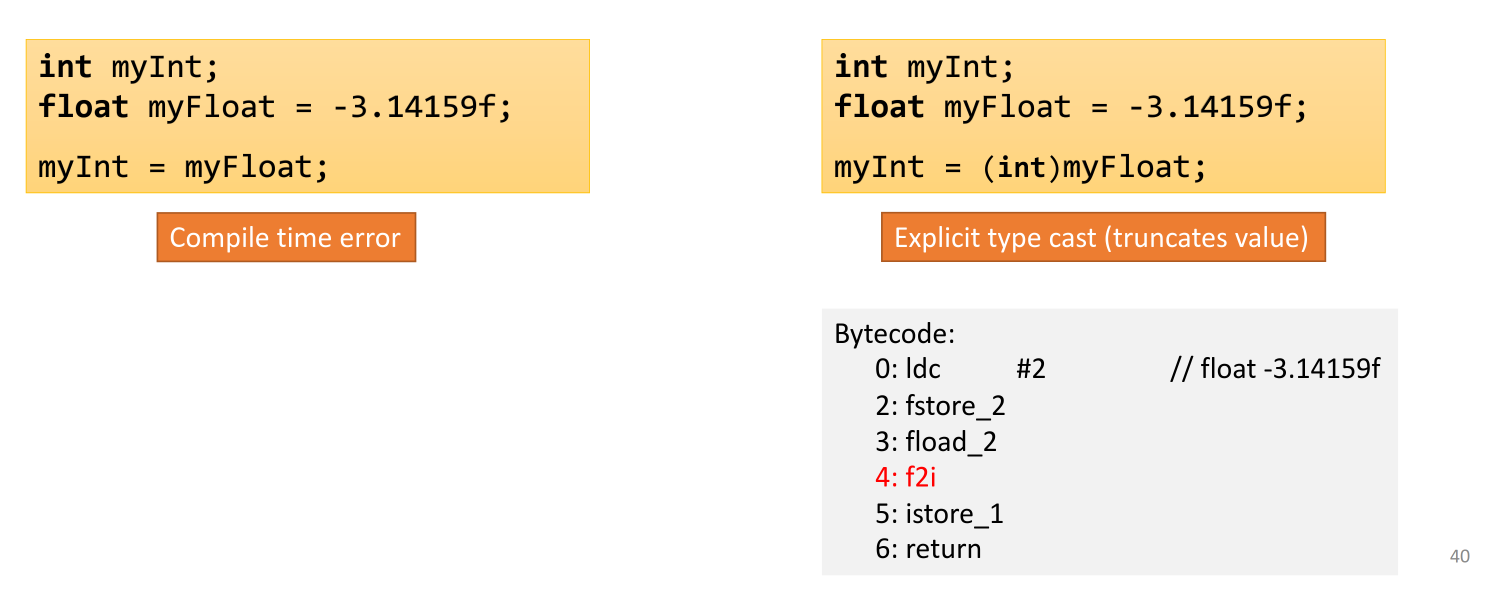 Java is a strongly typed language. The compiler enforces type compatibility. Explicit type casts are sometimes required to convert between types, potentially with loss of information (e.g., casting a float to an int truncates the decimal part).
