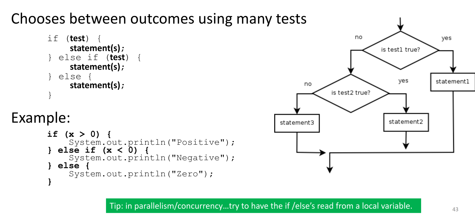 Nested if/else statements allow for multiple tests and different outcomes. In concurrent programming, it’s generally preferred to have if/else conditions depend on local variables to minimize potential race conditions.