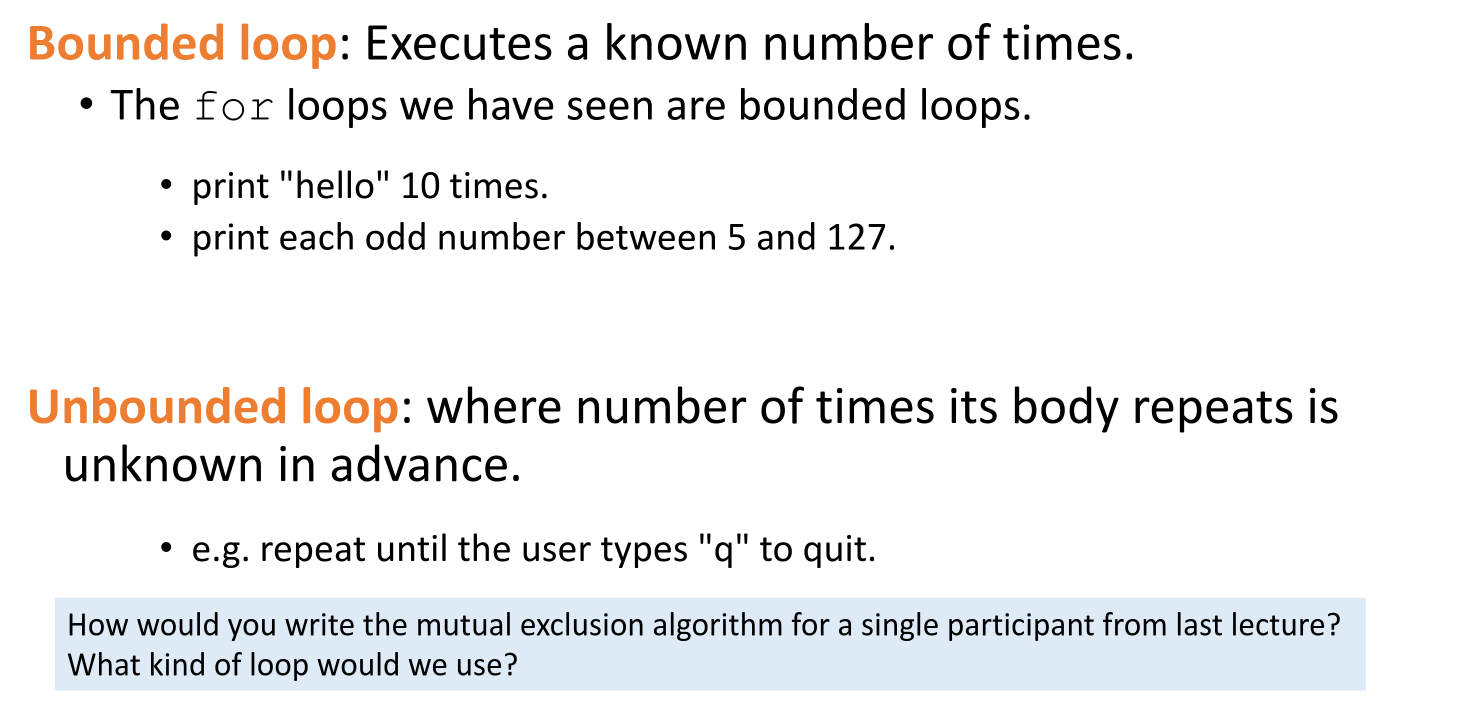 forloop). - Unbounded loop: The number of iterations is not known in advance (e.g.,
