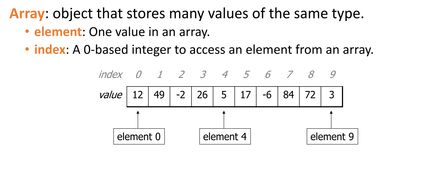 An array is an object that stores a collection of values of the same type. Elements are accessed using a 0-based index.