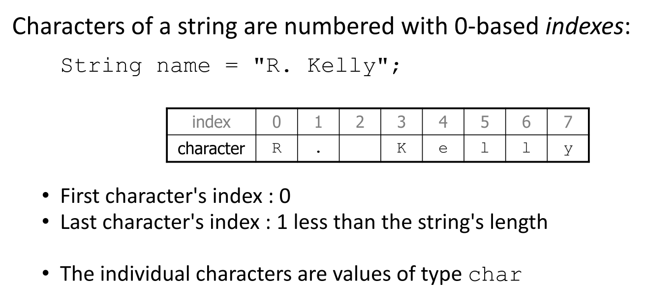Characters in a string are accessed using 0-based indexes.