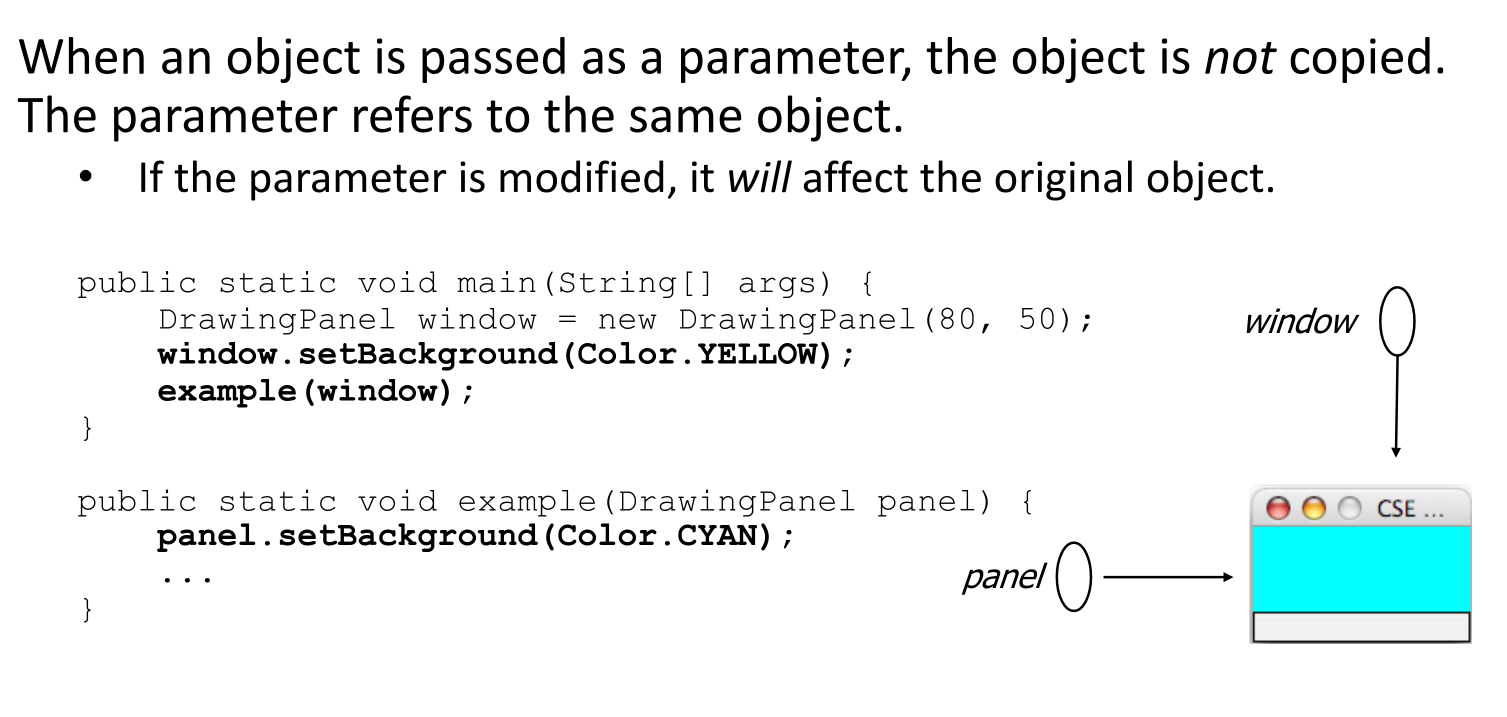 Arrays and objects use reference semantics. Assigning one object variable to another does not create a copy of the object; it creates another reference to the same object. This is important for both efficiency (avoiding large copies) and sharing data between different parts of a program.