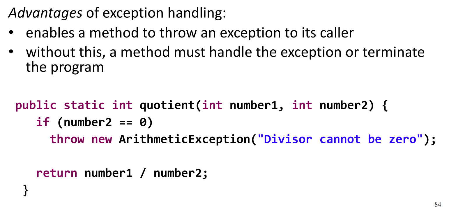 Exceptions provide a mechanism for handling errors. A method can throw an exception to its caller.