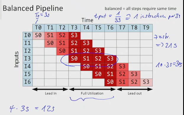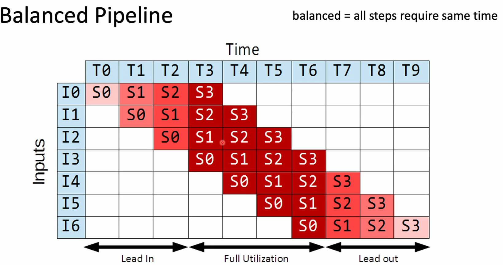 This graph shows a balanced pipeline. Each row represents a different “input” (like a load of laundry), and each column represents a time unit. Notice how the stages overlap, and the pipeline is fully utilized after an initial “lead-in” period.