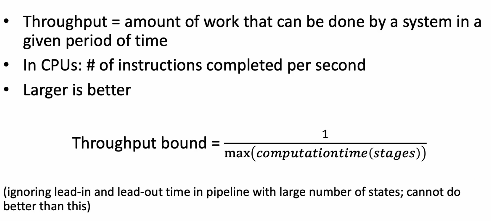 Throughput: The rate at which work is completed. In our laundry example, it’s the number of loads of laundry finished per hour. In a CPU, it’s the number of instructions completed per second.
