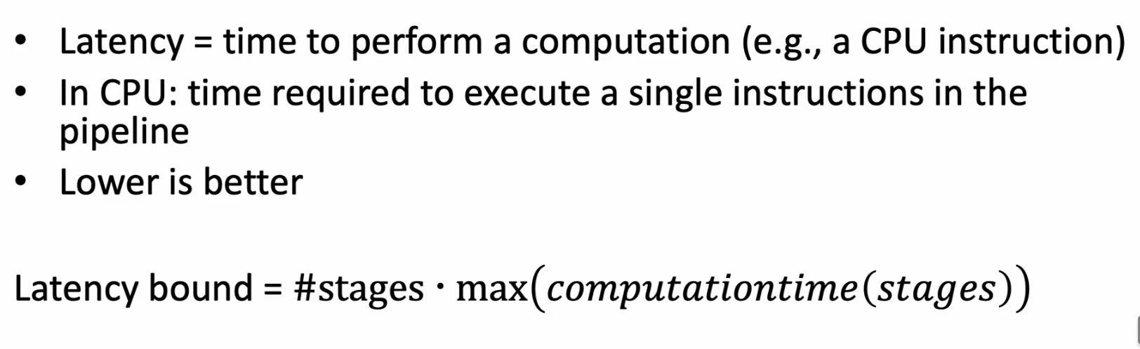 Latency: The time it takes for a single task to complete. In our laundry example, it’s the time it takes to wash, dry, fold, and store one load of laundry. In a CPU, it’s the time it takes to execute a single instruction.