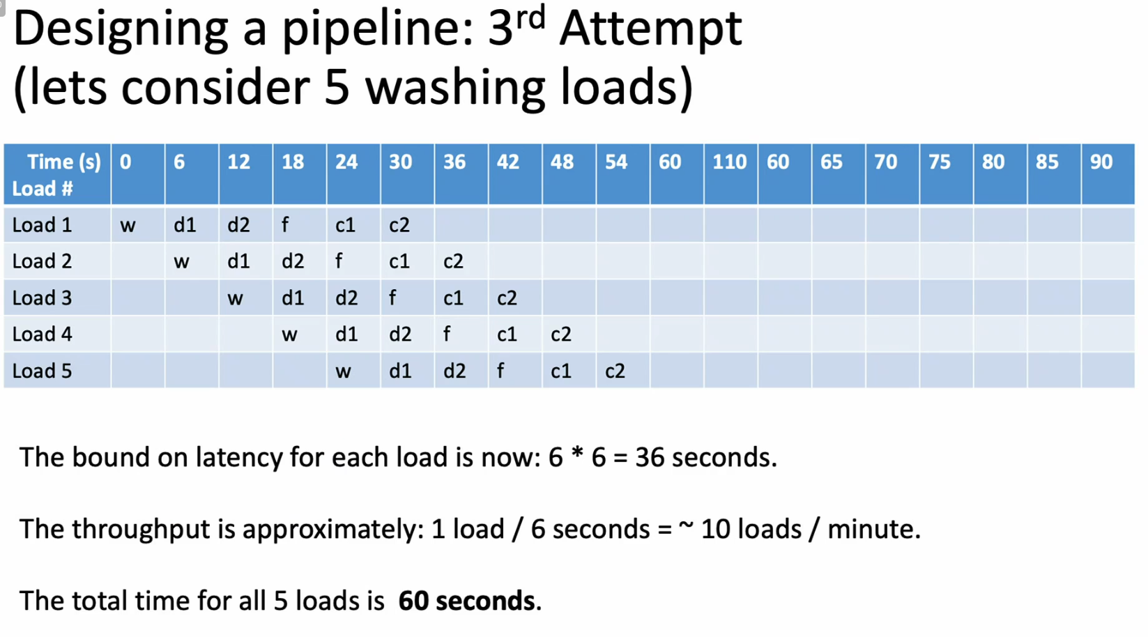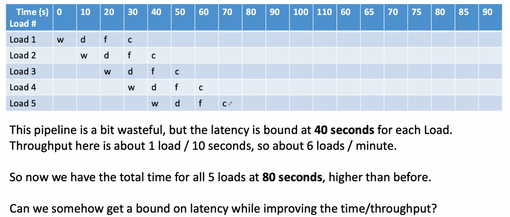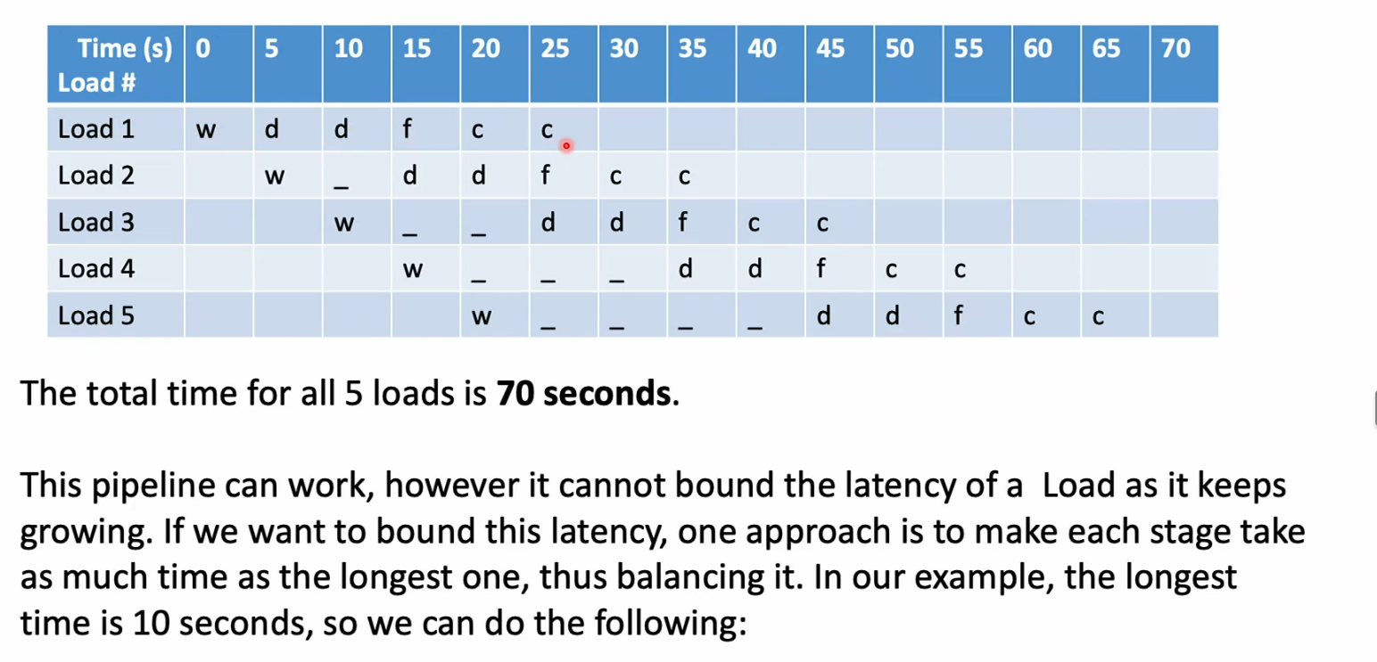 One way to “balance” the pipeline is to make all stages take as long as the slowest stage (10 seconds in this case). This will reduce the idle time, but it also increases the latency of each individual load.