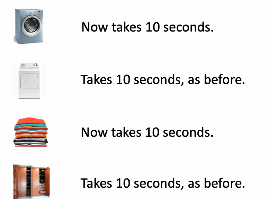 If we simply pipeline this as is, the dryer and store stages will be bottlenecks. The washing machine and folding station will be idle much of the time, waiting for the slower stages to finish. The total time to wash a few loads will be 70 seconds, at first.