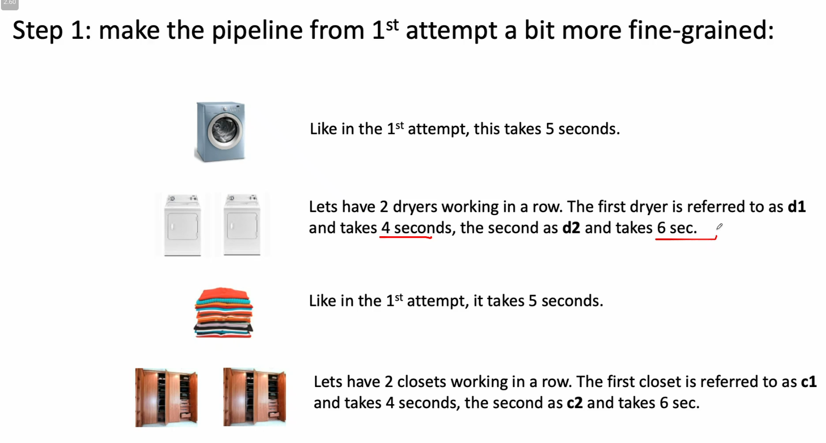 A better approach is often to subdivide the slower stages. For example, we could get two dryers, one that takes 4 seconds (d1), and the other that takes 6 (d2). We also do that to the two “closets”: