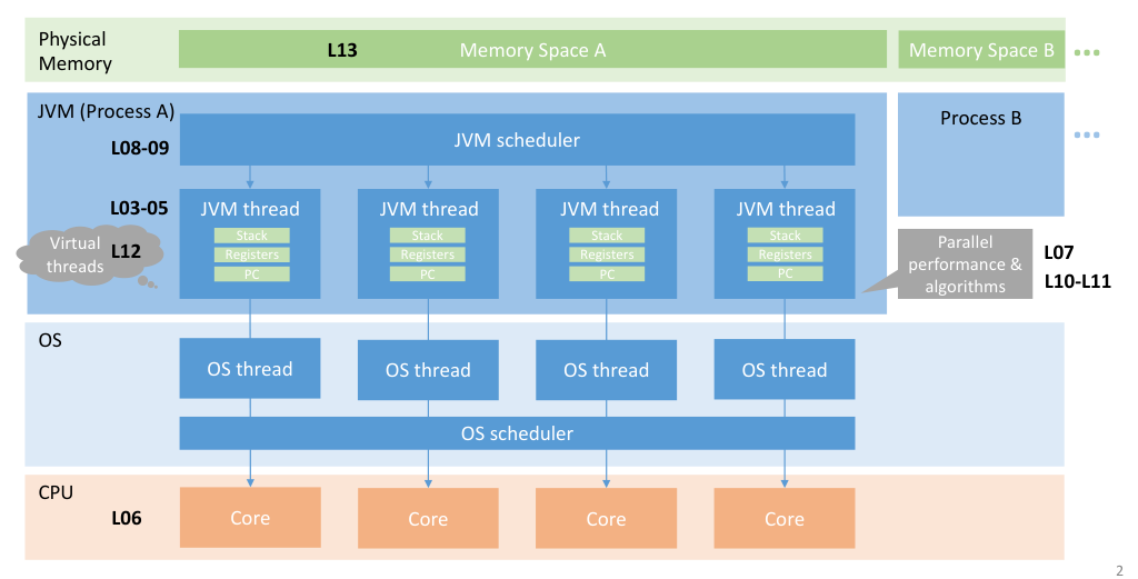 - OS Scheduler: The operating system’s scheduler, which assigns OS threads to CPU cores.