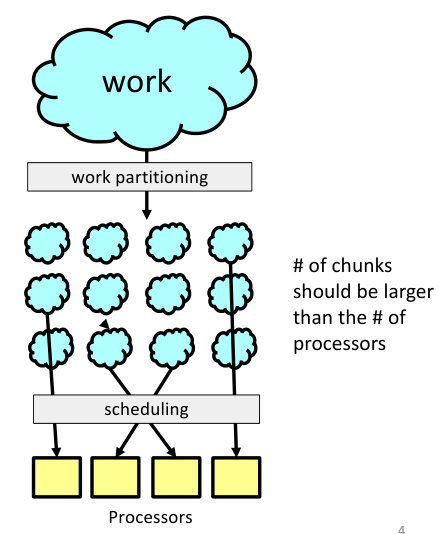 Work partitioning is the what (what are the independent tasks?), and scheduling is the how (how are those tasks assigned to processors?).