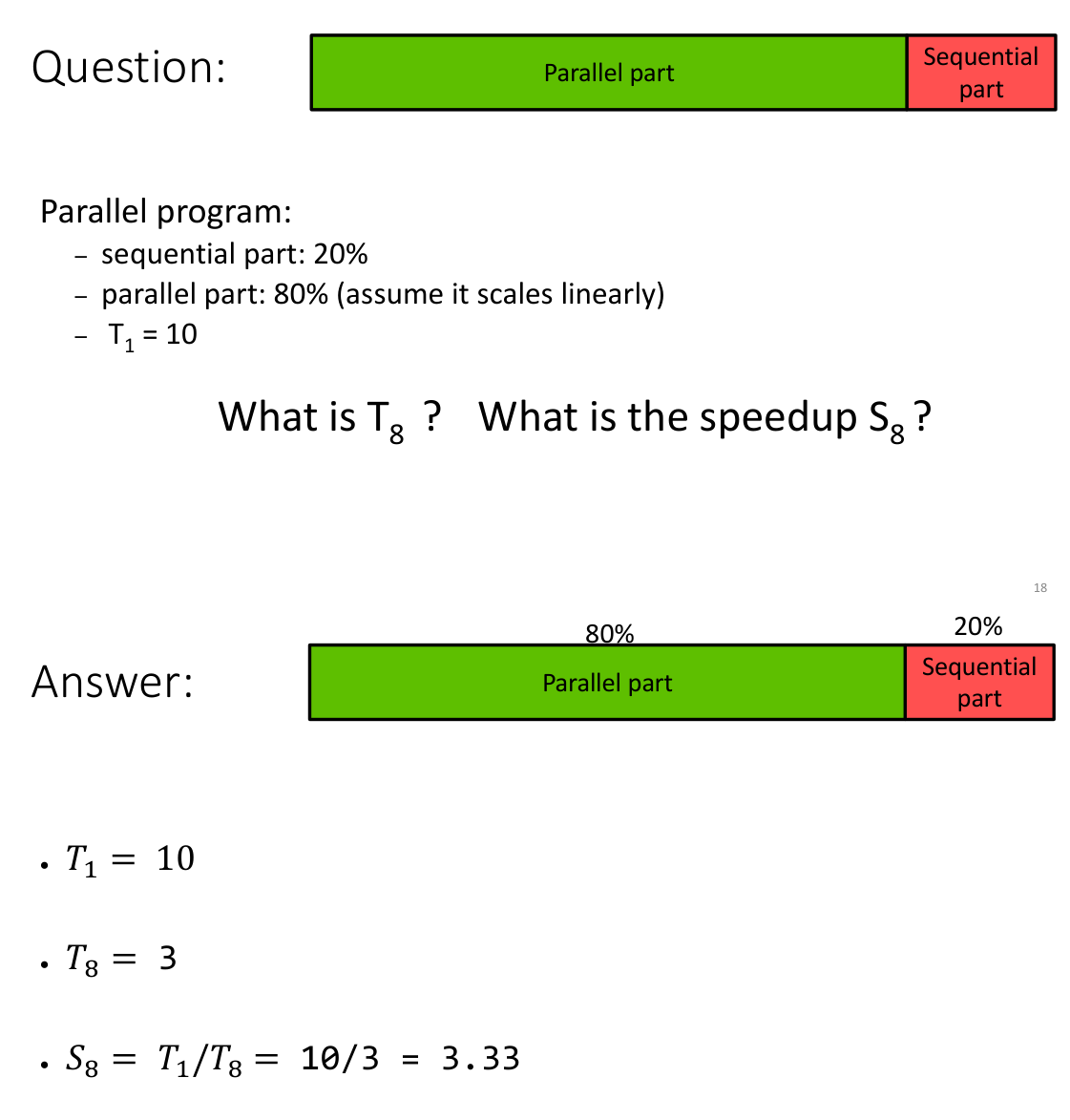 Notice that even though 80% of the program scales perfectly, we only achieve a speedup of 3.33 on 8 processors. The sequential portion (20%) limits the overall speedup.