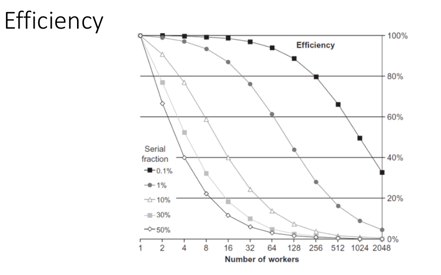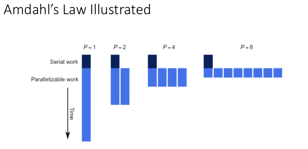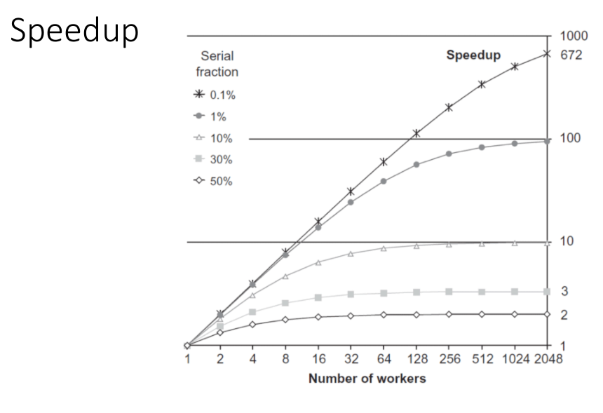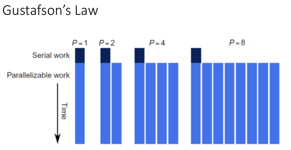 - Gustafson’s Law: Assumes a fixed execution time. We’re willing to solve larger problems if we have more processors, keeping the execution time constant.