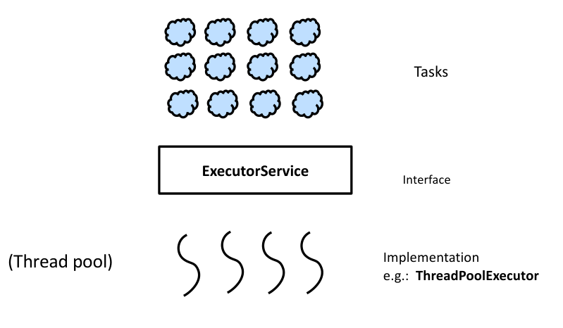 ExecutorService: An interface that represents an asynchronous execution mechanism.ThreadPoolExecutor: A concrete implementation ofExecutorServicethat uses a thread pool.- Tasks: These tasks are distributed on threads.